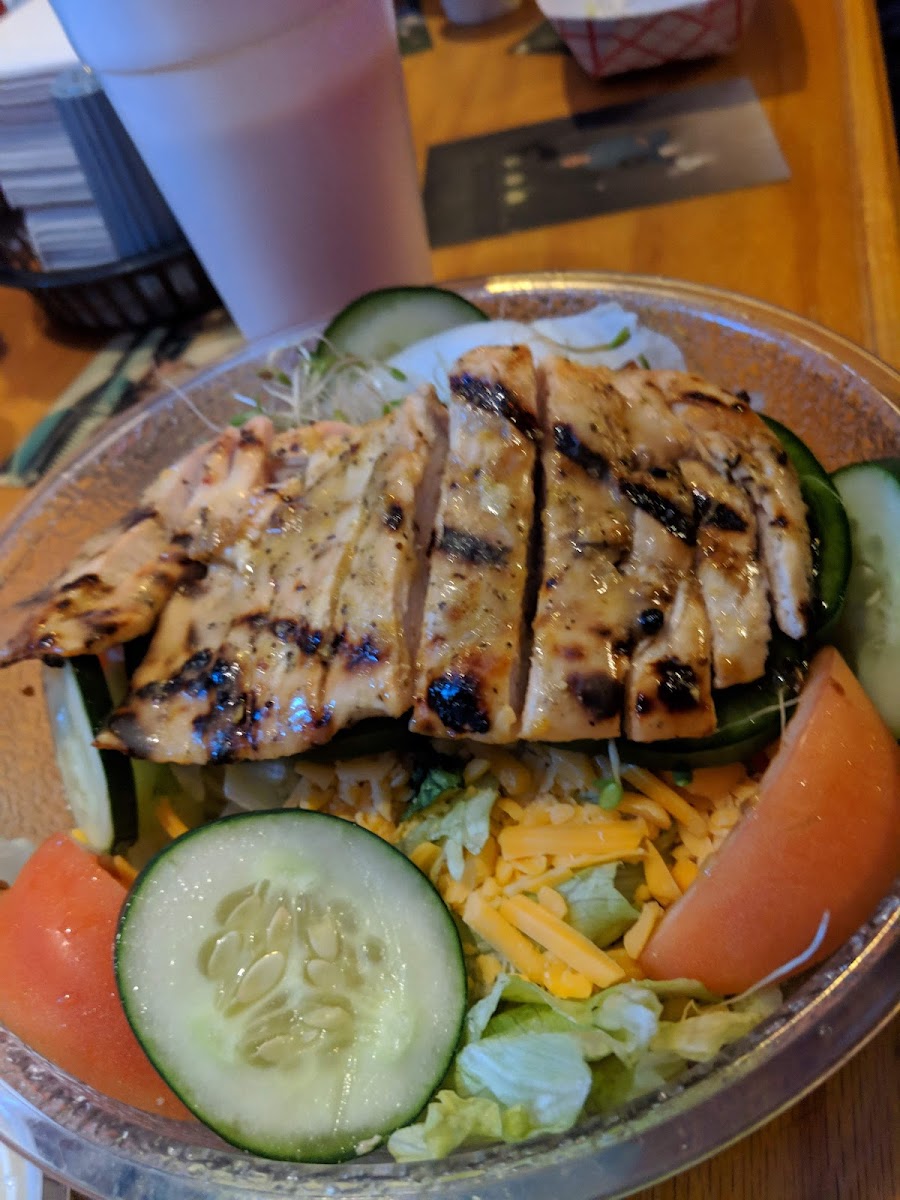 The steak salad was really good. The steak was tender and seasoned well. The vegetables were fresh. The blue cheese and ranch dressings were homemade and very good. Our server was friendly and attentive, and prices were reasonable.